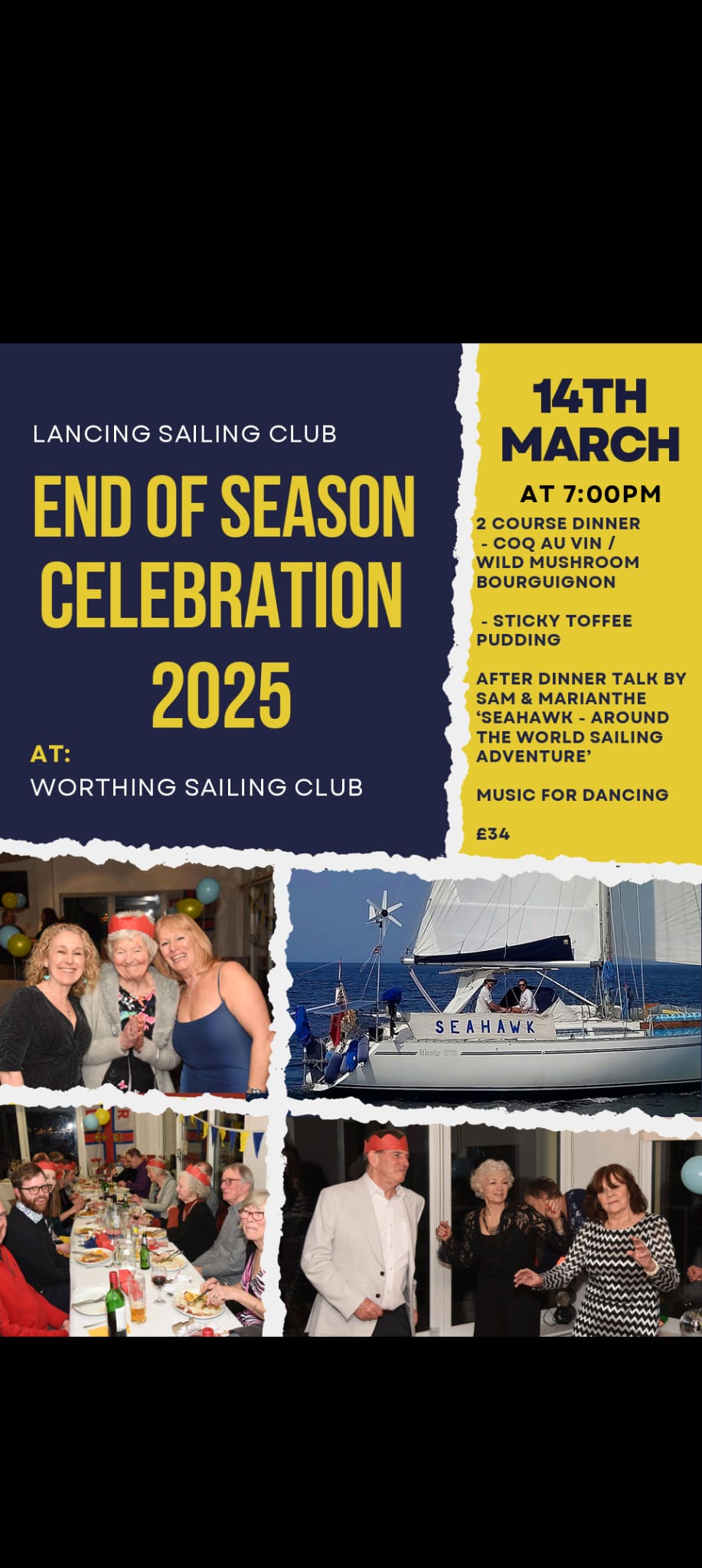 FeaturedWorthing Sailing Club 1 Sea Place, Worthing, United KingdomJoin us for our annual End of Season Dinner albeit a little later than previous years! 2 Course Dinner After Dinner talk "Seahawk- Around the world sailing adventure by Sam & Marianthe Music and Dancing! £34 Menu Coq Au Vin or Wild Mushroom Bourguignon Sticky Toffee Pudding
